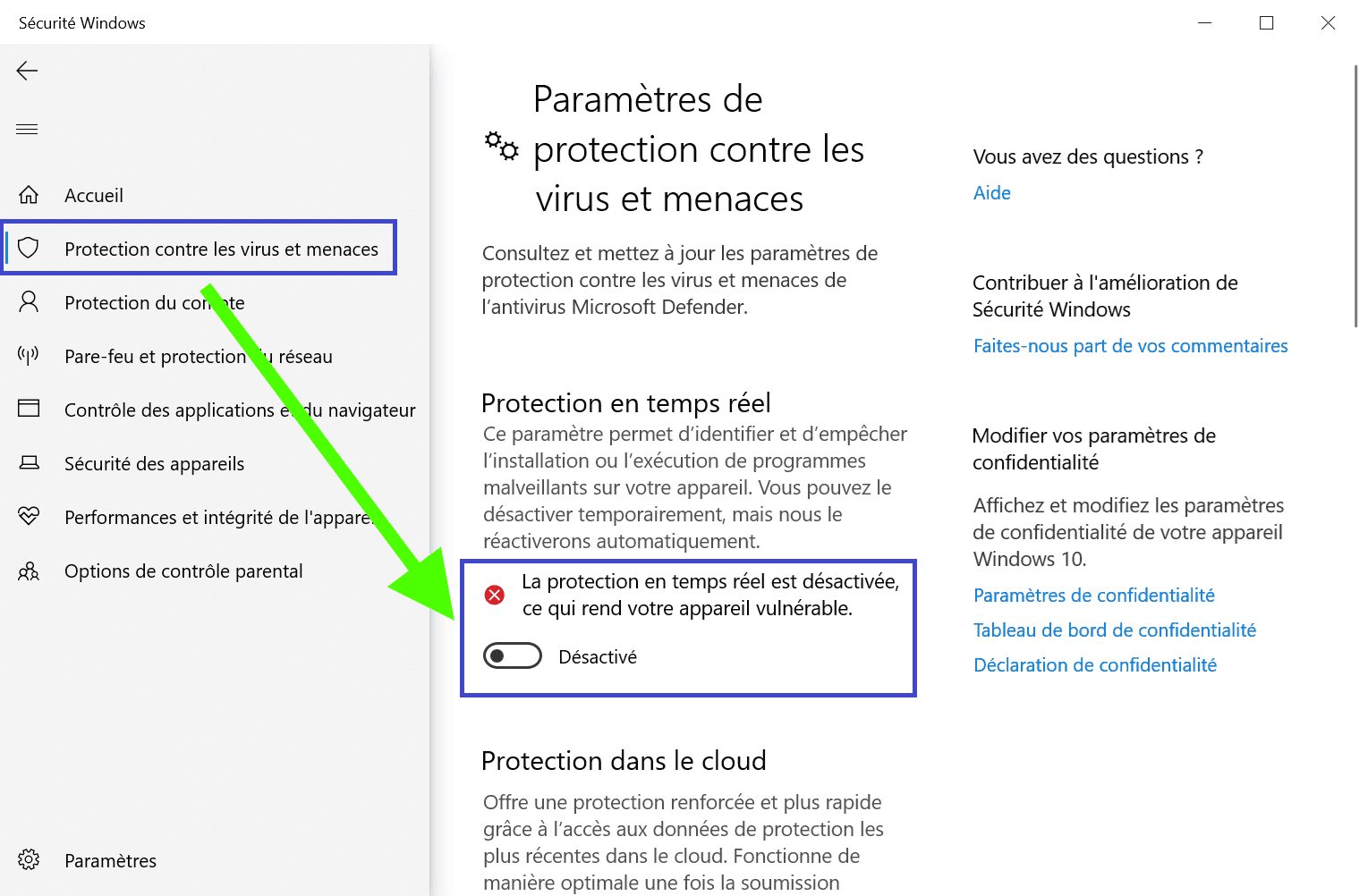 - Puis désactivez la Protection en temps réel.