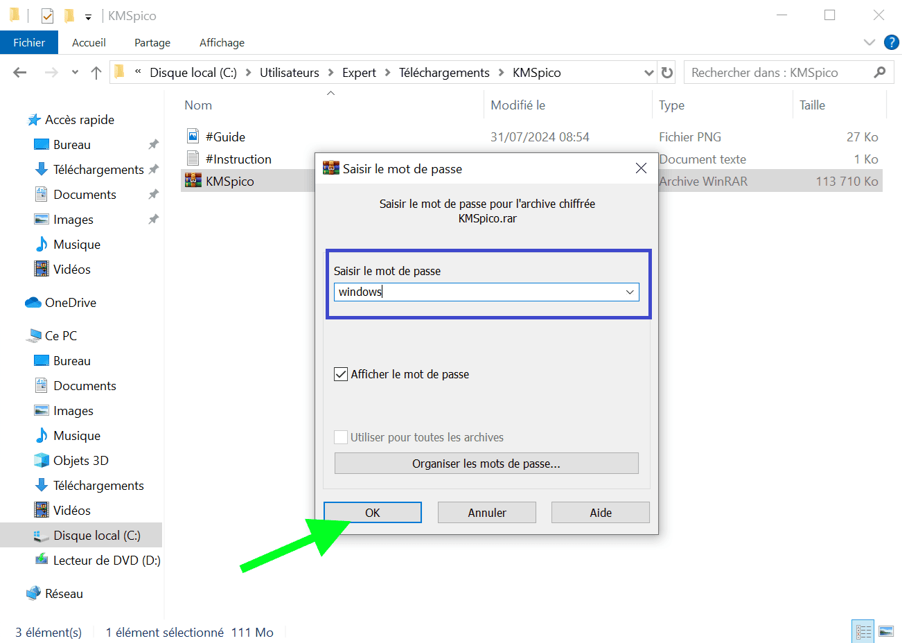 - Une fois le téléchargement terminé, dézippez-le en utilisant le mot de passe – windows. Pour décompresser, utilisez l’application – WinRAR.